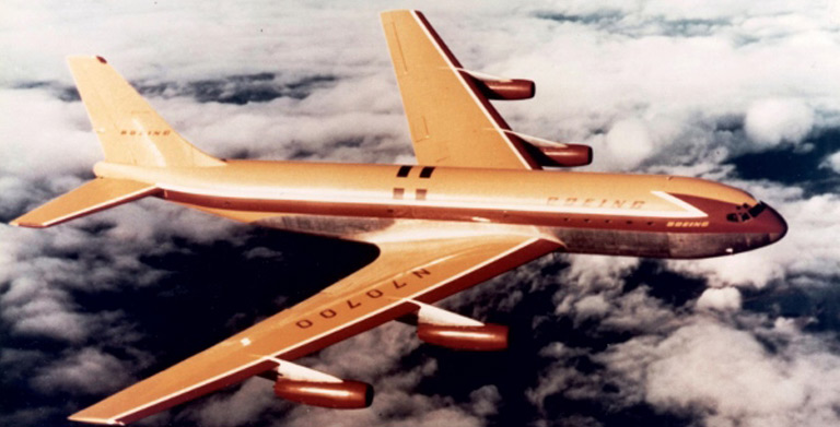 Provides coverage for prototype Boeing 707 jet airliner. The aircraft model goes on to become one of the first successful commercial airliners.