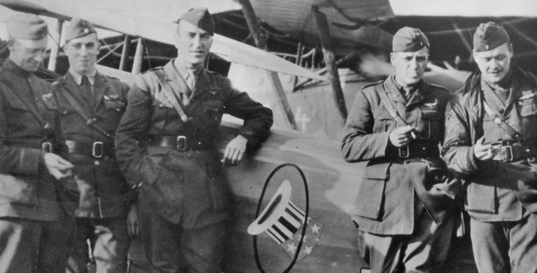 USAIG co-founder Reed M. Chambers, second from right, with other officers of the famous 94th “Hat-in-the-Ring” Squadron, led by Captain Eddie Rickenbacker (third from left). This combat team was largely responsible for crippling the “Flying Circus” of Captain Manfred von Richthofen (the Red Baron) and hastening the conclusion of World War I.